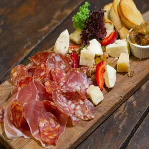 Finocchiona, prosciutto, jamón pierna, queso, fior di latte perfumado, granapadano, salsa de queso azul, frutos secos, acompañados de tostadas caseras.